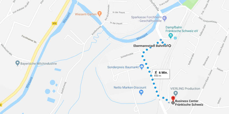 Das Business Center liegt nur ca. 15 Minuten von der Autobahn A73 und 30 Minuten von der A9 entfernt. Außerdem ist der Bahnhof nur 450m (6 Min zu Fuß) entfernt. Der Zug verkehrt stündlich zwischen Forchheim und Ebermannstadt. Mehr Infos HIER unter der Website des Betreibers Agilis.